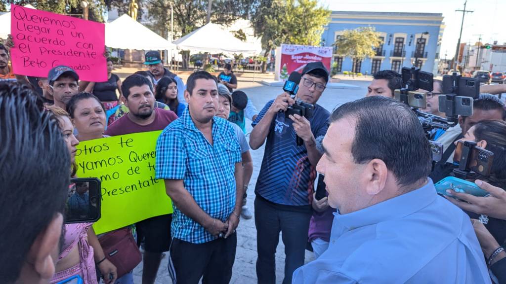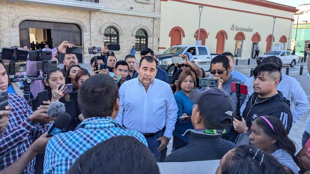 Matamoros, Tamaulipas.- El secretario del Ayuntamiento de Matamoros, Manuel Cuauhtémoc Perusquía Ramírez, dialogó de manera personal con un grupo de manifestantes de oficio «carretonero» y reiteró la apertura del presidente municipal Alberto Granados Fávila para que se integren a las filas del personal municipal y sigan llevando el sustento a sus hogares.