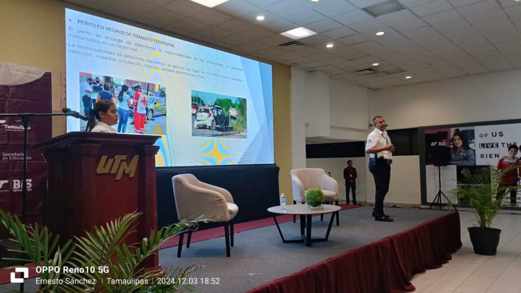 Matamoros, Tamaulipas – La Dirección de Tránsito y Vialidad de Matamoros, encabezada por el Lic. José Luis García, en coordinación con la Secretaría de Seguridad Pública Municipal dirigida por el Lic. Eduardo Jeu Silva Capistrán, impartió una conferencia sobre cultura vial a mil 500 estudiantes de la Universidad Tecnológica de Matamoros (UTM).