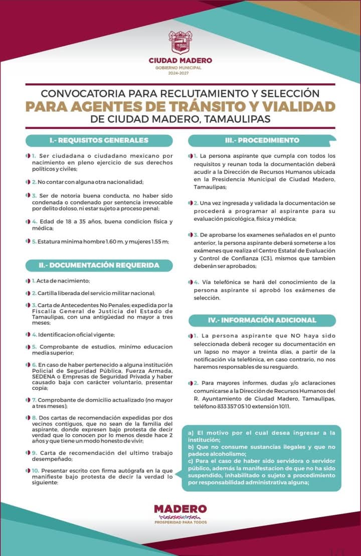 El Gobierno Municipal de Ciudad Madero lanzó la convocatoria, para el reclutamiento y selección de nuevos agentes para la dirección de Tránsito y Vialidad, donde se establecen requisitos generales que deben de dar cumplimiento cada uno de los interesados en ser parte de esta corporación; esto como parte de un compromiso del presidente municipal Erasmo González Robledo, por integrar una corporación comprometido con el servicio público.