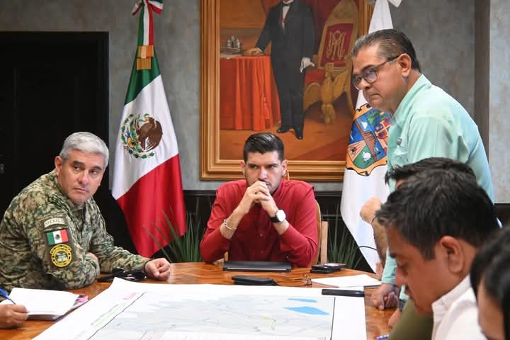 30 de marzo.- Este sábado , el Secretario de Recursos Hidráulicos para el Desarrollo Social en Tamaulipas, Ing. Raúl Quiroga Álvarez, el alcalde Alberto Granados Fávila y el Gerente General de la Junta de Aguas y Drenaje de la ciudad de Matamoros, sostuvieron una reunión con autoridades de la SEDENA, Marina y Protección civil para coordinar acciones ante la creciente del río bravo.