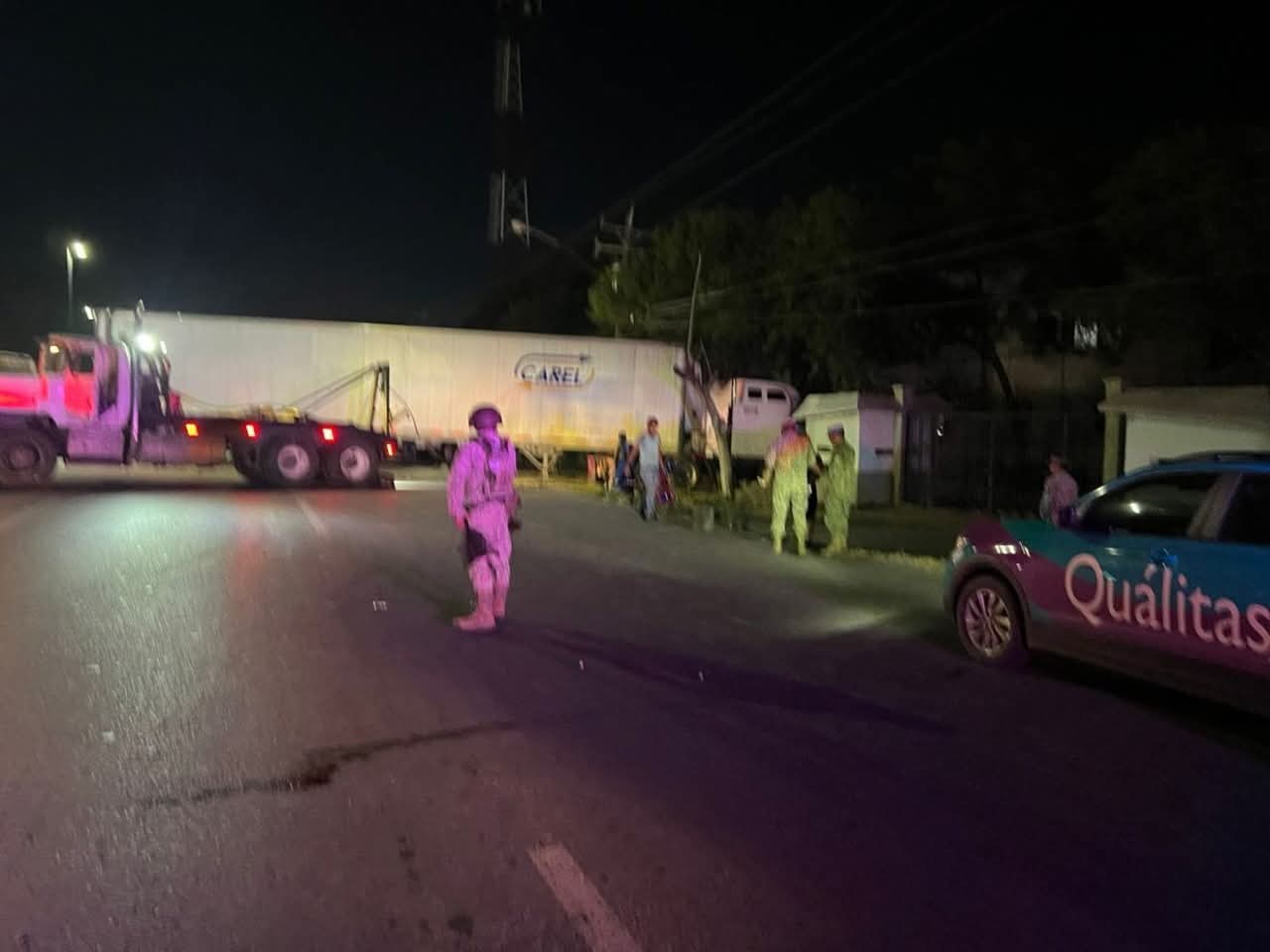 También personal militar salió del cuartel para dialogar con el conductor y representantes de la compañía aseguradora del tractocamión, con el fin de evaluar los daños y buscar una solución al incidente.