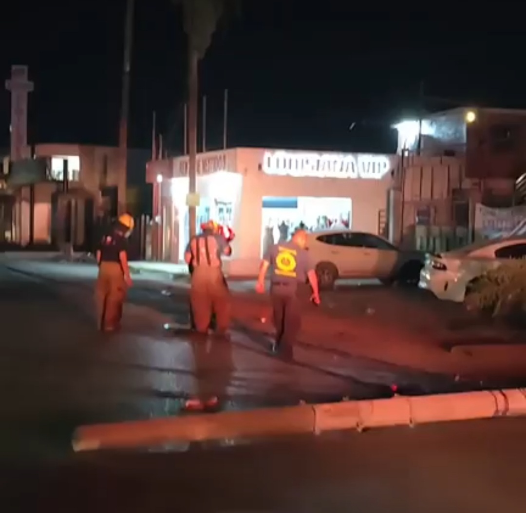 En la escena del choque personal de Bomberos se encuentran cortando las líneas de energía que quedaron tiradas en el pavimento para evitar riesgos y para liberar la circulación mientras llega personal de CFE.