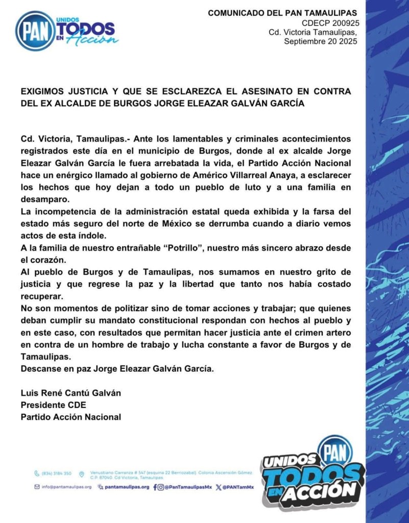 A través de un comunicado, el presidente del Comité Directivo Estatal del PAN, Luis René Cantú Galván, cond3nó lo que calificó como un “cr1m3n art3ro” lamentó profundamente el hecho viol3nt0 “que ha dejado a una familia en luto y a todo un pueblo sumido en la tristeza e indignación”.