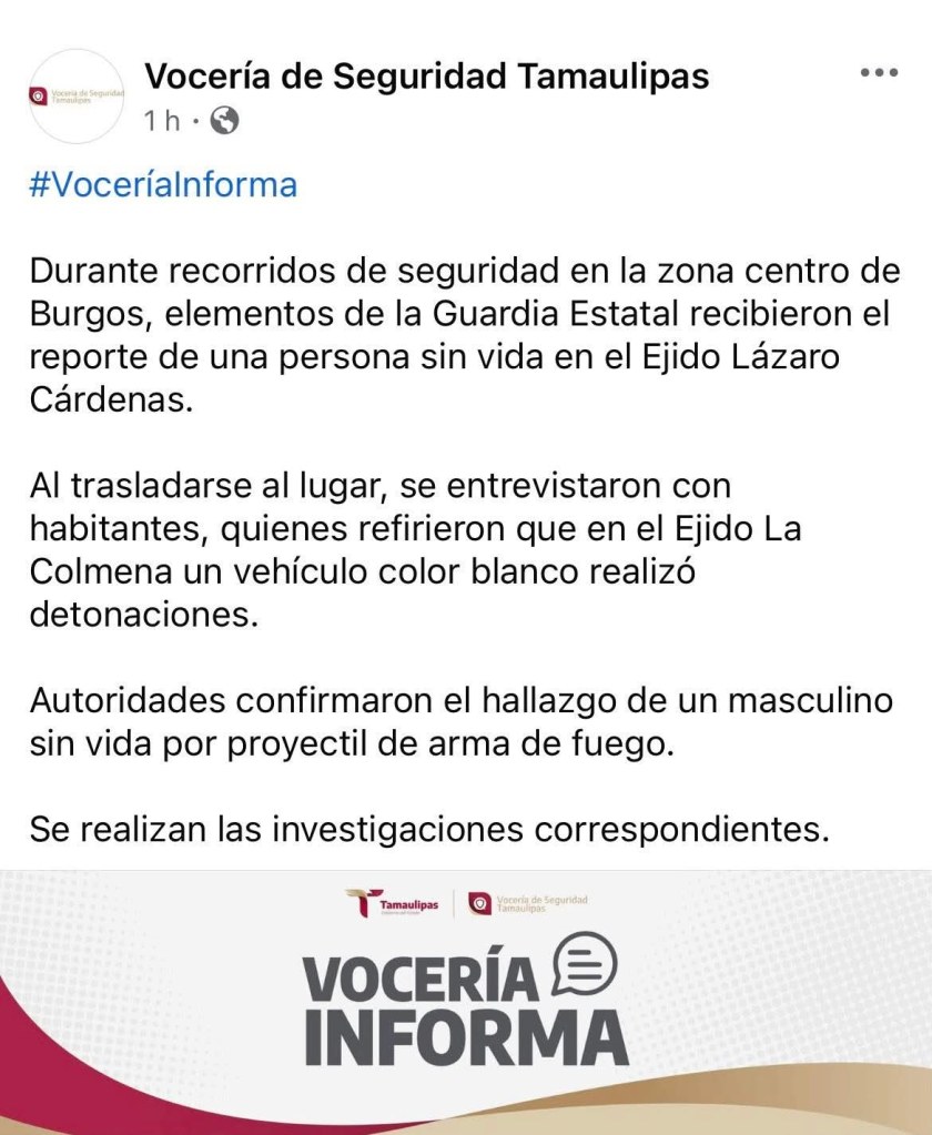 La Vocería de Seguridad de Tamaulipas publicó en sus redes sociales que tras recorridos de seguridad en la zona centro de Burgos, elementos de la Guardia Estatal recibieron el reporte de una persona s1n v1d4 en el Ejido Lázaro Cárdenas.