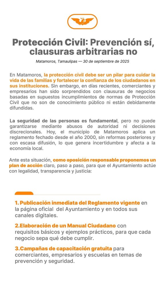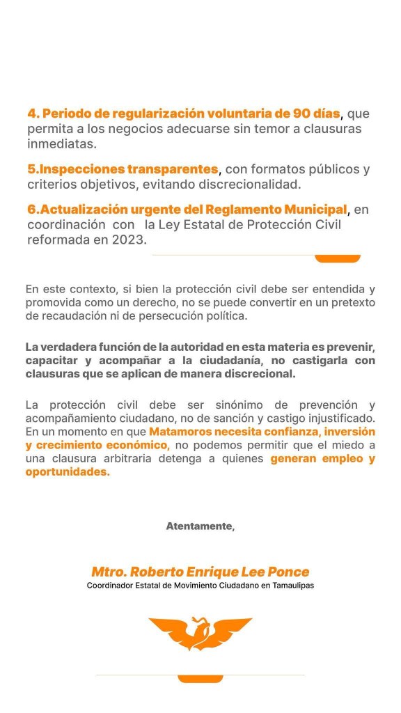 Ante lo sucedido en Matamoros, desde Movimiento Ciudadano Tamaulipas, no permitiremos ningún abuso de poder contra los negocios locales, que generan fuentes de empleos para nuestras familias.