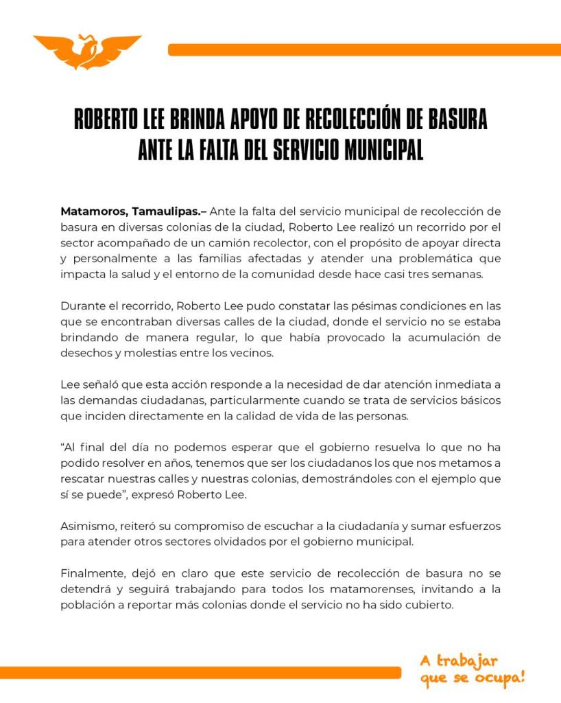 H. Matamoros.- Ante la falta de servicio municipal de recolección de basura 🗑️, en diversas colonias de la ciudad, Roberto Lee realizó un recorrido por el sector acompañado de un camión recolector de basura 🚛, con el propósito de apoyar directa y personal mente a las familias afectadas y atender una problemática que impacta la salud y el entorno de la comunidad desde hace casi tres semanas.