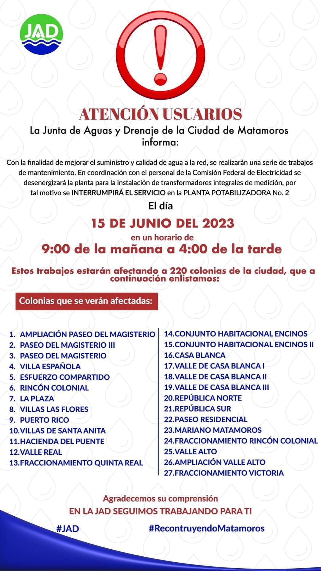 IMPORTANTE ‼️ Interrupción del agua el próximo jueves 15 de junio en alrededor de 220 colonias de #Matamoros