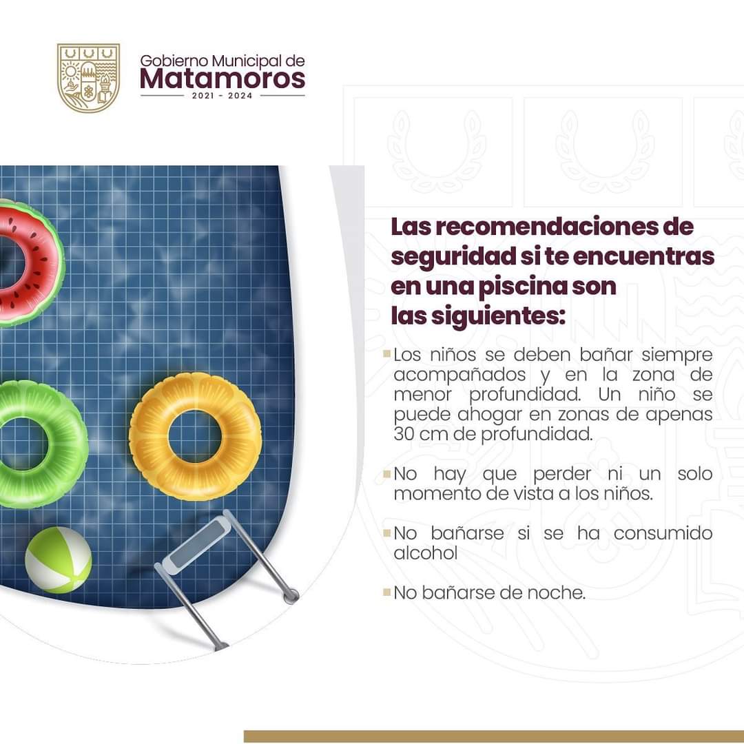 El Gobierno Municipal de Matamoros te da las siguientes recomendaciones de seguridad en el uso de las albercas 🏖️🕶️🩴🏊♂️☀️