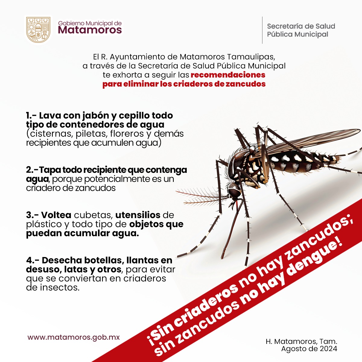 Es esencial que cada uno de nosotros actúe eliminando los criaderos de mosquitos en nuestros hogares y aprendiendo cómo prevenir enfermedades como el dengue, zika y chikunguña. Tu participación es clave para mantener un entorno libre de riesgos. ¡#MatamorosEsTuyo, trabajemos por el bienestar de todos!Beto Granados