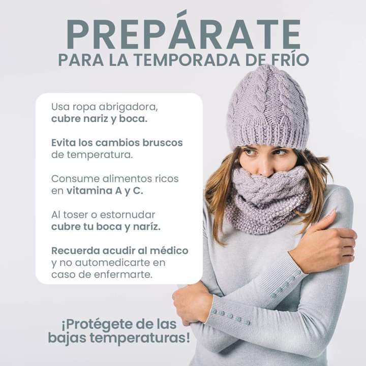 Ante las bajas temperaturas protégete y protege a tu familia.Abrígate bien y sigue las recomendaciones de la Secretaría de Salud Pública Municipal.Recuerda que al cuidarte evitamos enfermedades respiratorias y la propagación del Covid-19.