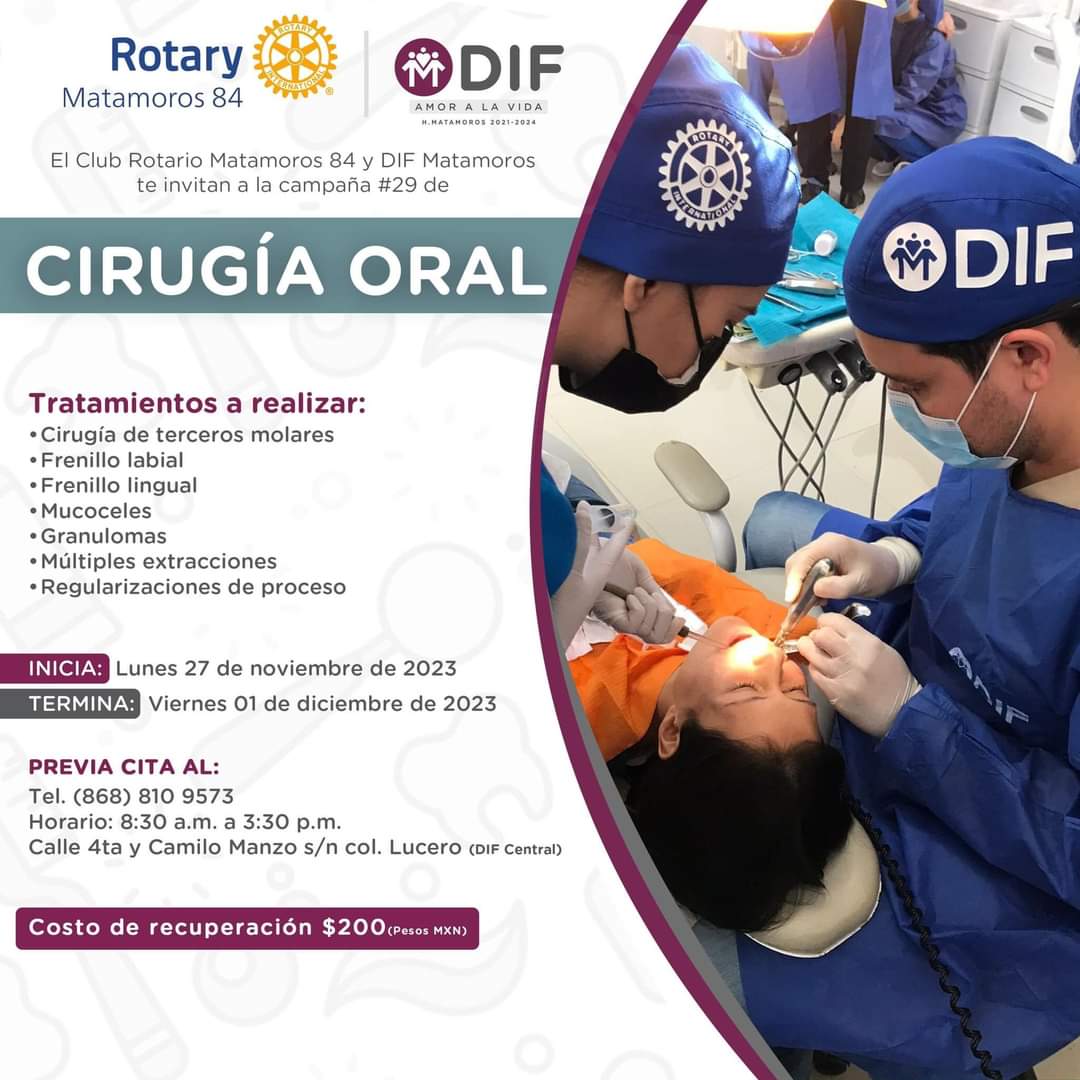 El Sistema DIF Matamoros en coordinación con el Club Rotario Matamoros 84 te invitan a la campaña #29 de Cirugía Oral. 🦷
