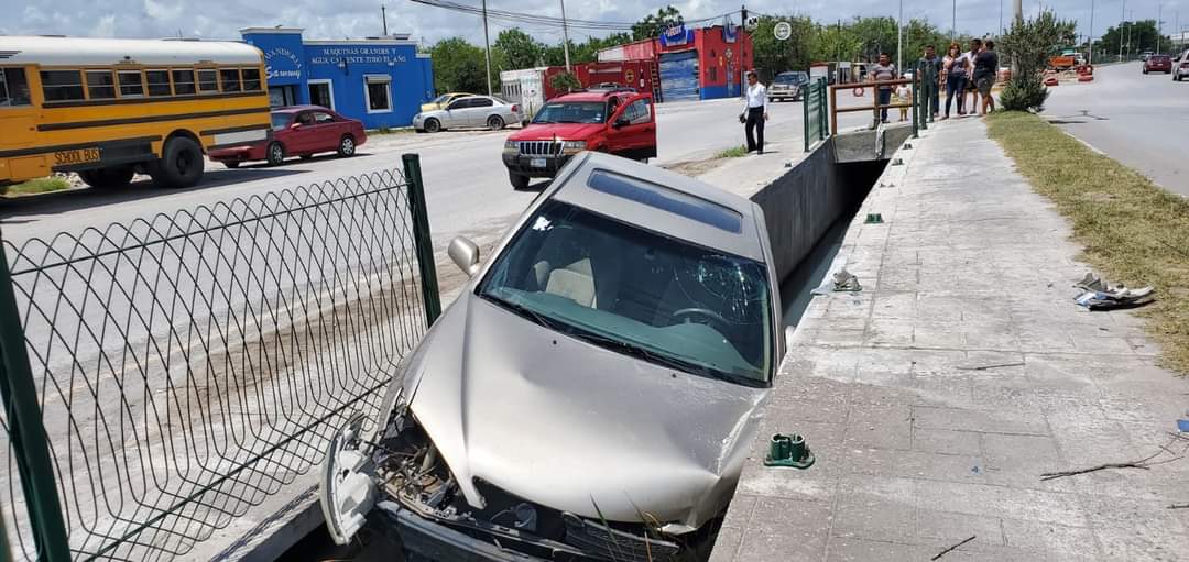 joven conductora pierde el control de su unidad al darle un cerrón una camioneta y casi cae en canal de aguas negras