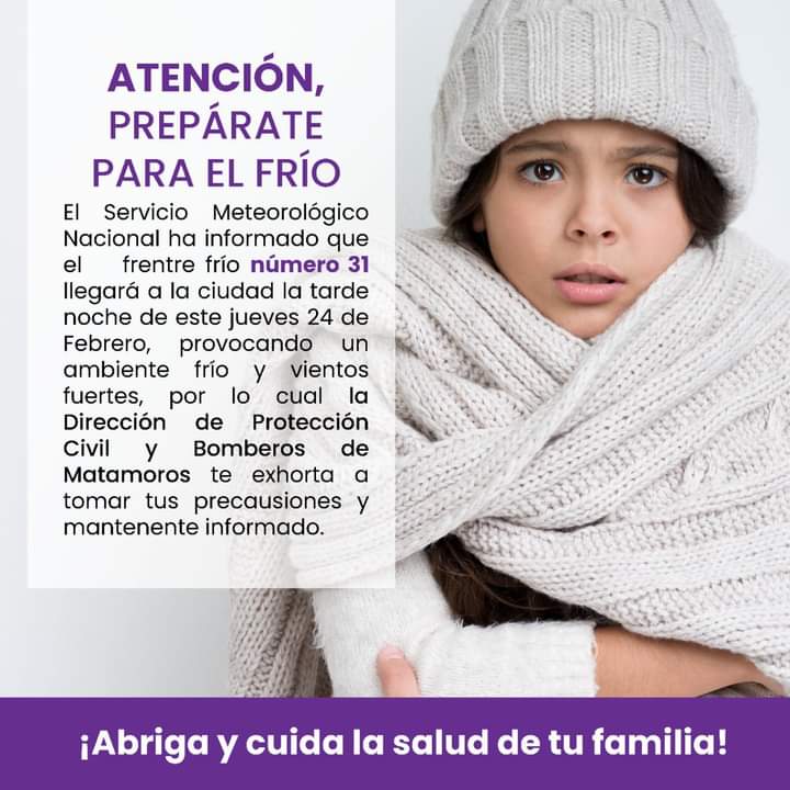 La Dirección de Protección Civil y Bomberos de Matamoros te informa:Prepárate para la entrada del frente frío N•31 ❄️ mantente atento e informado de la información proporcionada por las autoridades ❄️¡Cuida tu salud 🤧 y la de tu familia además protege también la salud de tus mascotas!