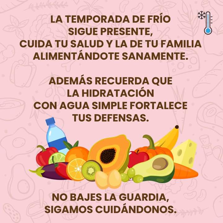 Una alimentación correcta evita el riesgo de adquirir enfermedades.Al tener una alimentación balanceada mantenemos un cuerpo fuerte 💪🏻.No bajes la guardia e incluye alimentos ricos en vitaminas A y C durante la temporada de frío