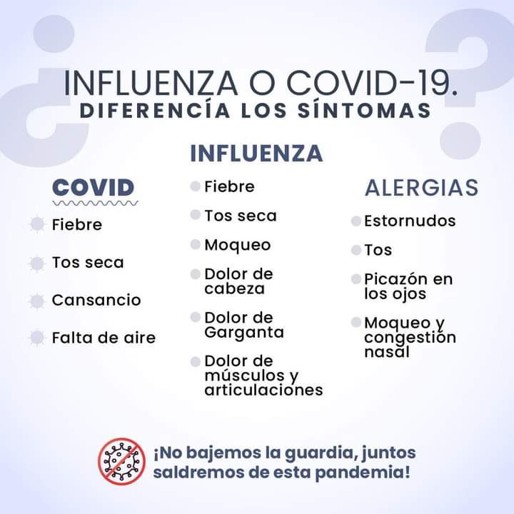 La Secretaría de Salud Pública Municipal te informa: Por su sintomatología la INFLUENZA y el COVID-19 pueden confundirte.Al ser virus diferentes pueden generar un contagio combinado, infórmate y vacúnate.¡NO TE RELAJES Y CUIDA LA SALUD DE LOS QUE AMAS!