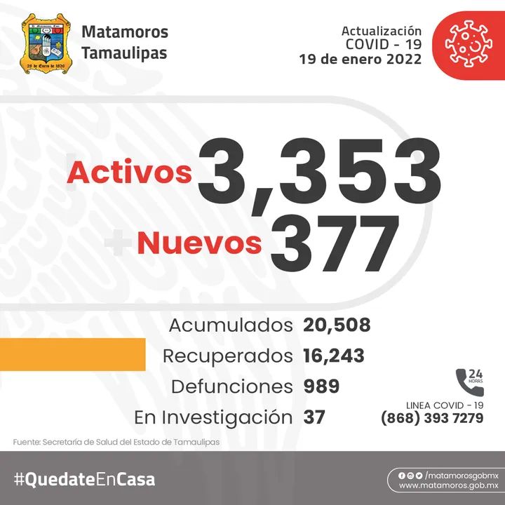 La secretaria de salud municipal informa que actualmente Hay activos 3,353 casos de covid-19 377 casos nuevos Acumulados 20,508 Recuperados 16,243 Defunciones 989 En investigación 37 quedateencasa «Este Programa es Público, ajeno a cualquier partido politico. Queda prohibido el uso para fines distintos a los establecidos en el programa».