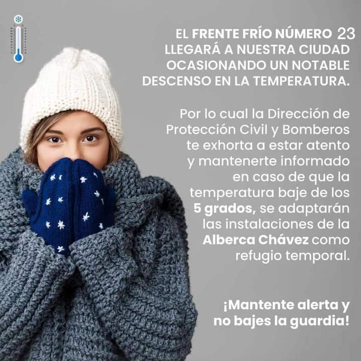Con la llegada del frente frío número 23❄️ asegúrate de usar la ropa adecuada, comer sanamente y resguardar a niños, adultos mayores y mascotas.En caso de ser necesario, la Dirección de Protección Civil y Bomberos 🚒 adaptará las instalaciones de la Alberca Chávez como albergue,mantente informado y comunícate al: 8688120003 en caso de que la temperatura esté por debajo de los 5 grados centígrados.