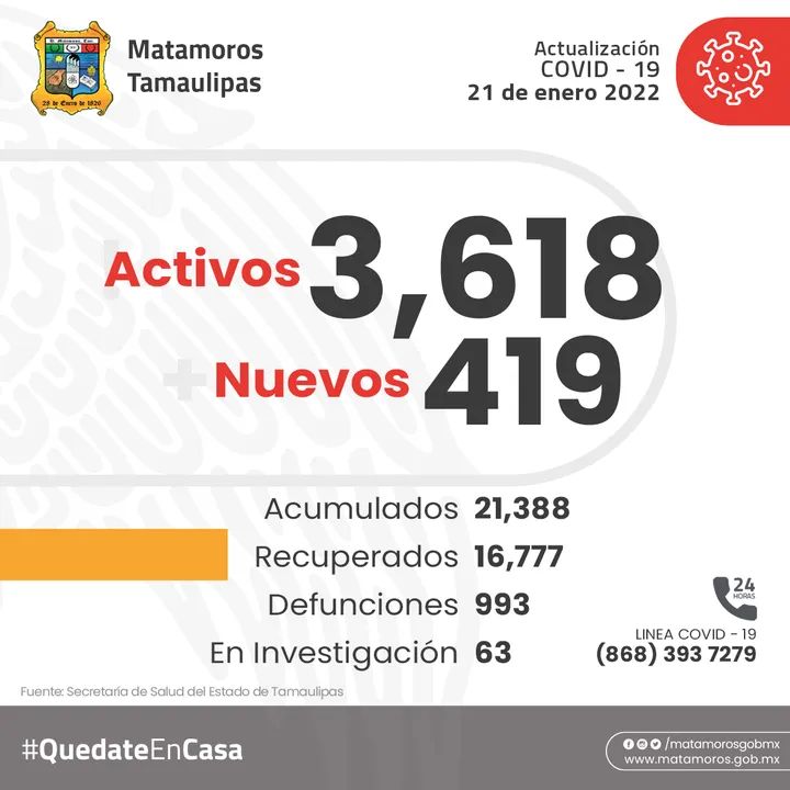 La secretaria de salud municipal informa que actualmente Hay activos 3,618 casos de covid-19 419 casos nuevos Acumulados 21,388 Recuperados 16,777 Defunciones 993 En investigación 63 quedateencasa «Este Programa es Público, ajeno a cualquier partido politico. Queda prohibido el uso para fines distintos a los establecidos en el programa».