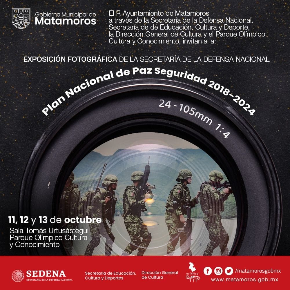 En el Plan nacional de seguridad, la secretaría de la defensa nacional a través de la dirección general de cultura y deporte te invita para que asistas a la exposición fotográfica que estará a tu disposición en el parque olímpico del 11 al 13 de octubre