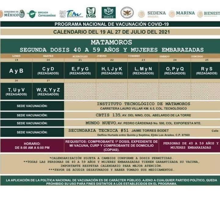 Será a partir del lunes 19 de Julio al 28 sedes Mundo nuevo,Tecnologico de Matamoros ,CBTIS 135 Llevar comprobante de la primera dosisCopia del CURPY comprobante de domicilio. Busca en el calendario de la imagen la letra de tu apellido.